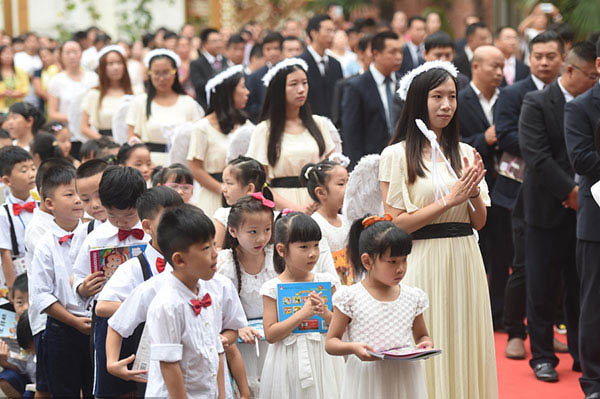Luoyang, 06/09/2015(El Pueblo en Línea)-Lo que parece una boda de surrealista de ni?os peque?os es en realidad una ceremonia para celebrar el primer día de escuela primaria de los más peque?os.