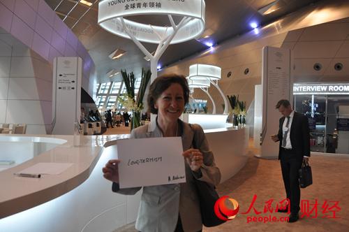 Sra. Helen Alderson, directora de recursos financieros y logística del Comité Internacional de la Cruz Roja de Ginebra, Suiza (CICR) utilizó "longtermism” (perspectiva a largo plazo) para explicar su confianza en el crecimiento económico de China. Ella dijo que en muchos países del mundo el crecimiento económico es lento, mientras que la economía de China ha mantenido un alto crecimiento, algo extraordinario. El desafío más grande de China puede ser su gran población. Existen todavía muchas zonas pobres, y algunas tienen una gran diferencia con las zonas desarrolladas en cuanto a nivel económico. Dijo que a largo plazo tiene confianza en la economía china, y espera que la reforma de China lleve a su economía por el camino correcto.