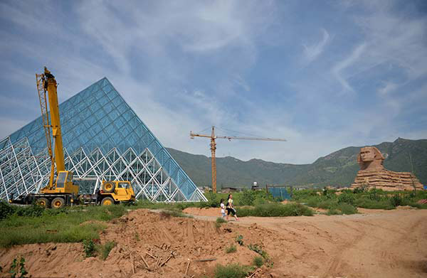 Shijiazhuang, 15/09/2015(Pueblo en Línea)-La réplica de la esfinge egipcia ya tiene compa?eros de reparto en Hebei, la nueva pirámide de cristal que se está construyendo a las afueras de Shijiazhuang, réplica de la famosa pirámide del Museo del Louvre, informó chinafotopress.