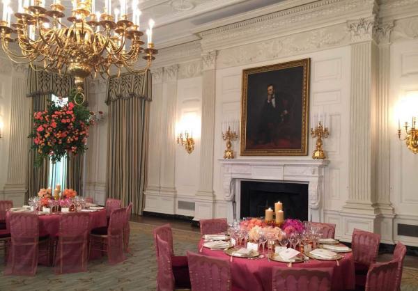 En la disposición de la mesa, se usa manteles de color rosa colocado por encima de un floral de rosas. La Casa Blanca dijo que el rosa es un símbolo de banquete de Estado, sino que también refleja la amistad y el respeto mutuo entre los Estados Unidos y China. En la elección de la vajilla, se usa la porcelana blanca fileteada en dorado y los cubiertos de plata.