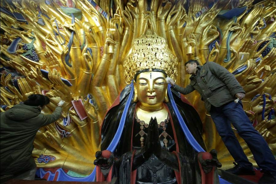 El proyecto de restauración de la estatua budista Kwan-yin de mil manos de Chongqing. [Foto: Xinhua]