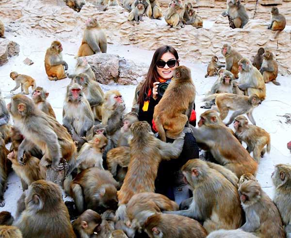 Una turista se hace foto con los monos en un lugar turístico de la provincia de Henan, el 10 de octubre de 2015. [Foto/chinanews.com.cn]