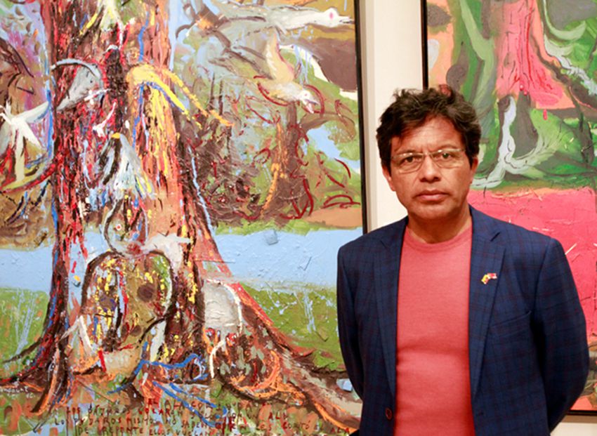 “Exponer en la 6ta Bienal Internacional de Pekín es traer un mensaje a China, que nos queda en el lado opuesto de la nuestra, geográficamente hablando. Desde la utilización del soporte, que no son lienzos tradicionales, sino cá?amos. Estos tejidos son utilizados para transportar mercancía, pero yo los reutilizo y desde ahí abordo el tema del reciclaje. Como extensiva poética significa salvar un árbol más. Y además, valorar este tejido que es nuestro, de la cultura andina, respetando su textura, su color original. El tejido como soporte, en el cuadro se percibe como ventanas abiertas de una piel natural, formando parte intrínseca de la obra.”