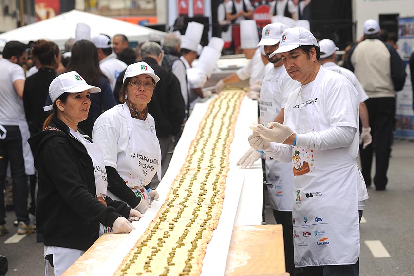 Para eso utilizaron un horno de cinta continua que funciona a gas y electricidad, 160 kilogramos de masa, 80 kilogramos de muzzarella, 20 litros de tomate y dos baldes de aceitunas.