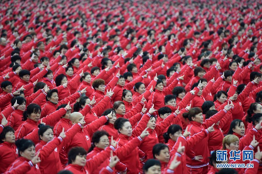 Los participantes de la coreografía en la plaza, vestidos con ropa roja, bailaron la versión anti-tabaco del éxito Little Apple el sábado por la ma?ana, para concienciar a la población sobre los riesgos de fumar para la salud. [Foto/Xinhua]