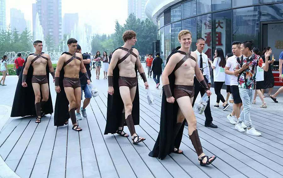 Modelos extranjeros vestidos con trajes de guerreros espartanos marchan por una calle durante una campa?a de promoción de Sweetie, un proveedor chino de ensaladas.22 de julio de 2015. [Foto: IC]