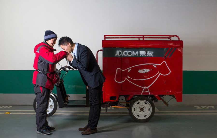 Pekín,11/11/2015(El Pueblo en Línea)-Richard Liu, presidente y director ejecutivo de la empresa china de comercio electrónico JD.com, besa la mano de Li Quan, quien acababa de hacer lo mismo a Liu cuando le prestó su triciclo para asistir a una reunión ejecutiva. JD.com ha surgido como otra Goliat de la venta minorista en línea, logrando forjar su propia identidad. 7 de enero del 2015. [Foto: IC]