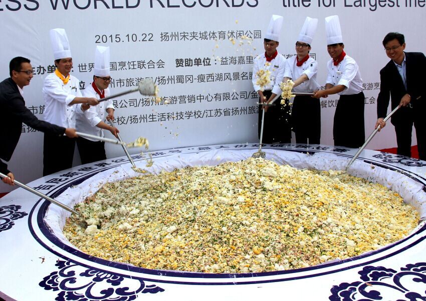 Yangzhou es famosa por su arroz frito con sabor a huevos, pepino de mar y otros ingredientes. Como parte de las celebraciones de la ciudad, Yangzhou trató de lograr un Guiness con sabor a arroz frito. Organizado por la Asociación Internacional de Cocina China, 300 chef cocinaron más de 4 toneladas métricas de arroz frito.Sin embargo, después de batir el récord, el organizador entregó 150 kilos de arroz a los cerdos y perdió el premio.