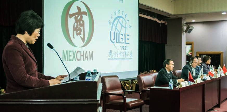 Dr. Wen Jun, rectora de la Universidad de Negocios Internacionales y Economía de Beijing (UIBE) interviene durante la sesión anual de la MEXCHAM. (Foto: Patricia Calvo)