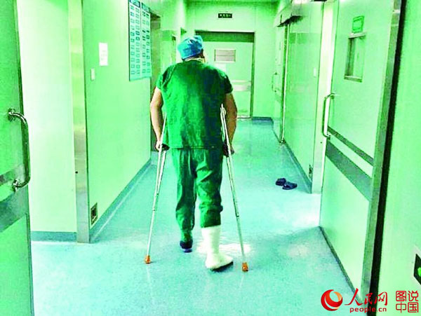 Leng Yong, cirujano de Xiaogan, provincia de Hubei, utiliza muletas para caminar hacia la sala de operaciones. (Foto: chinapic.people.com.cn)