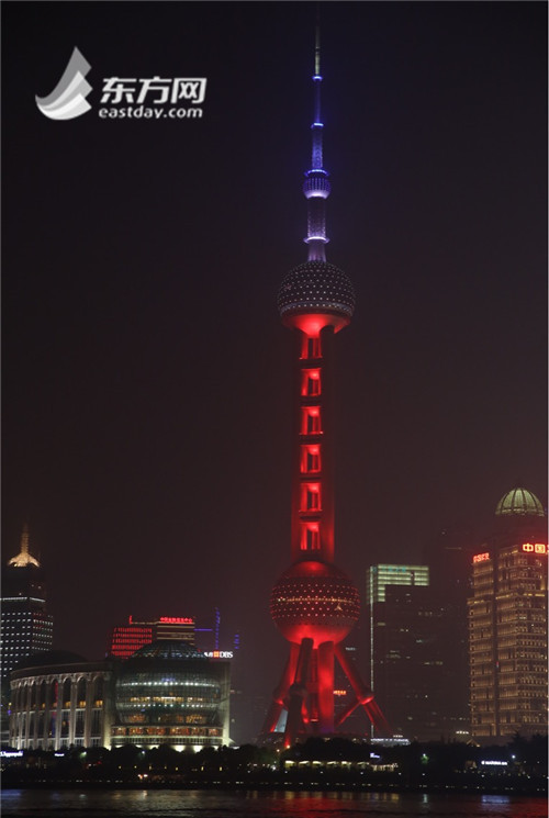 Torre Perla de Oriente, en Shanghai, iluminada con los colores de la bandera francesa para rendir homenaje a las víctimas de París.