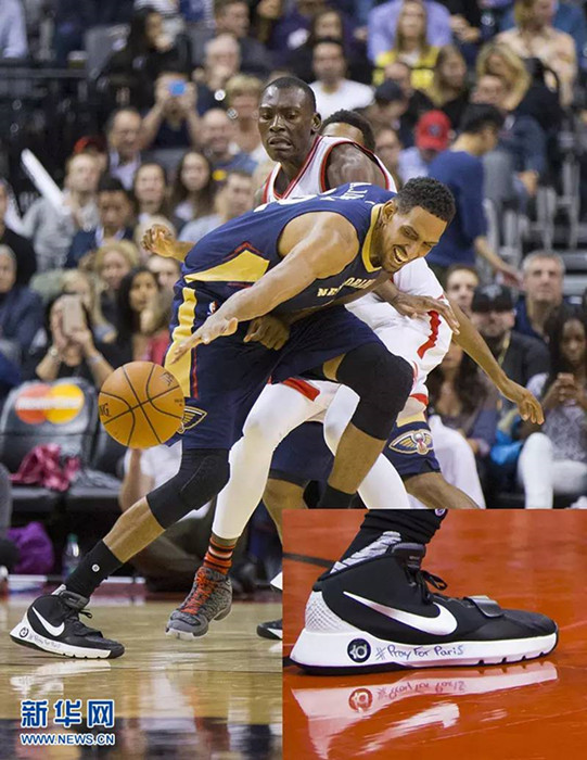 El jugador de la NBA, Alexis Ajinca, rinde homenaje a las víctimas del ataque terrorista en Francia con un mensaje en sus zapatillas deportivas "Pray for Paris" (recemos por París).