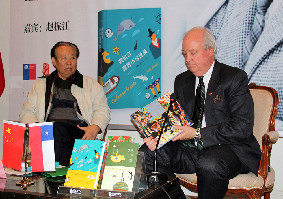 El Dr. Zhao Zhejiang (a la izquierda) y Jorge Heine, embajador de Chile en China, presentan en Pekín la versión autorizada de "Confieso que he vivido", memorias del poeta Pablo Neruda. (Foto: Cortesía)