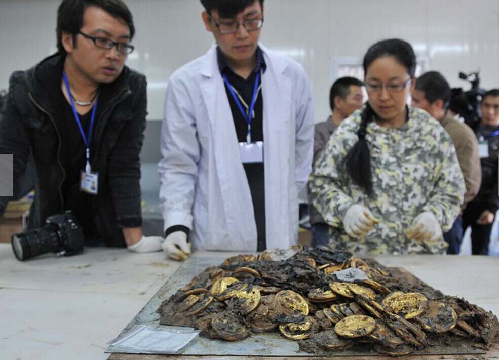 Expertos limpian las monedas de oro recién desenterradas de la tumba del Marqués de Haihun, en Nanchang, capital de la provincia oriental china de Jiangxi, el 21 de noviembre de 2015.