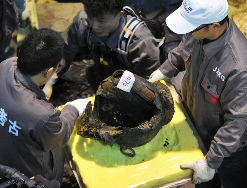 Una olla de bronce fue desenterrada de la tumba del marqués de Haihun, en Nanchang, capital de la provincia oriental china de Jiangxi, el 21 de noviembre de 2015.
