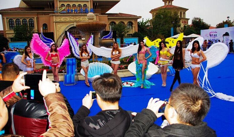 Diez modelos chinas en bikinis, ataviadas con alas de ángel, sin importarles el frío desfilaron al aire libre promoviendo nuevas ofertas inmobiliarias en la ciudad.