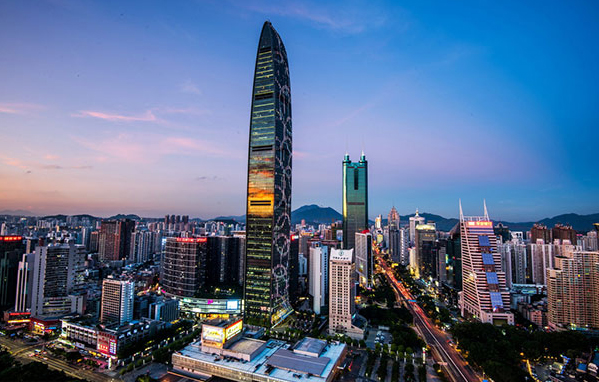 Una vista del monumento rascacielos Shenzhen Kingkey 100.