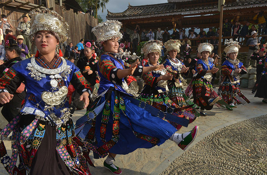 Cientos de mujeres Miao que viven fuera del pueblo volvieron a casa con regalos para sus madres y familiares. [Foto: Qin Gang]