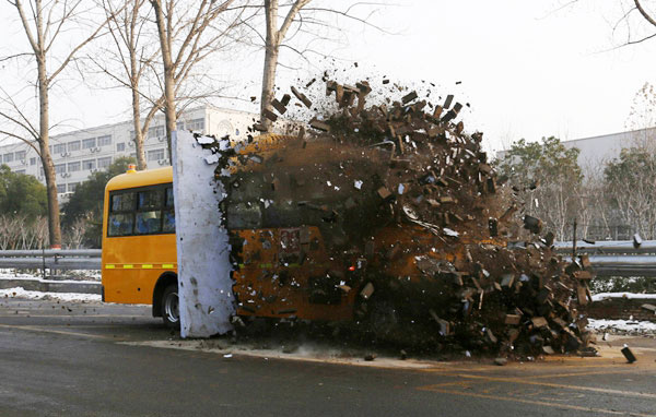 Durante una prueba de seguridad el viernes, en Zhengzhou, provincia de Henan, un conductor de autobús escolar condujo un autobús escolar nuevo a gran velocidad contra una pared de ladrillos construida a propósito para la prueba. La pared quedó totalmente derrumbada.