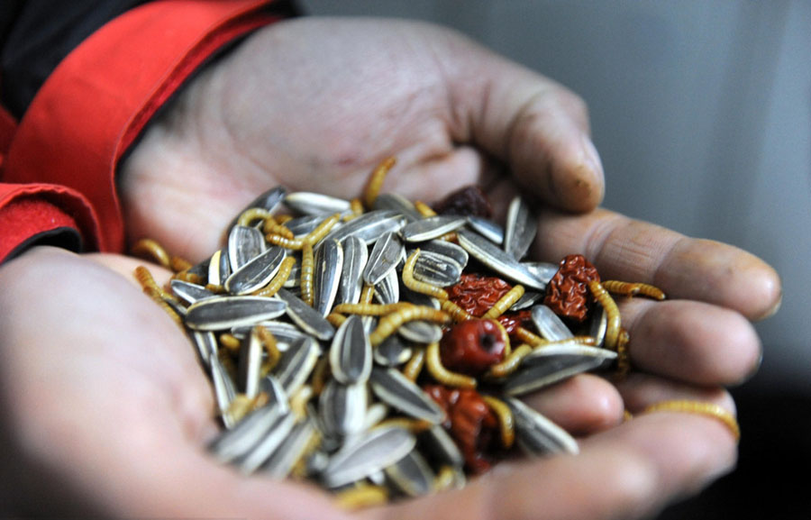 Un empleado de zoológico prepara alimentos ricos en calorías, incluyendo semillas de girasol, dátiles rojos y gusanos de harina para los animales del zoológico de Zhuyuwan en Yangzhou, provincia de Jiangsu, el 26 de noviembre de 2015. [Foto/IC]
