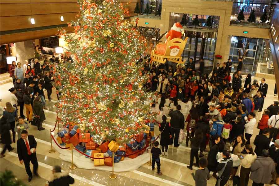 Espectadores durante la ceremonia de iluminación de Navidad en el lobby del hotel Kempinski del Lufthansa Center de Pekín, el 29 de noviembre de 2015. [Foto de chinadaily.com.cn]