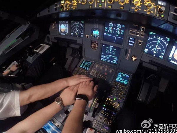 Dos pilotos se dan la mano en una cabina. [Foto de Weibo]