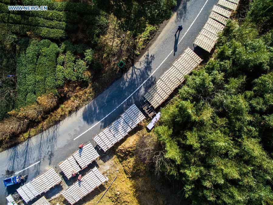 Los aldeanos secan fideos de almidón de boniato en Huzhou, provincia de Zhejiang, el 3 de diciembre de 2015. Los habitantes de zonas rurales tienen una costumbre de secar los fideos de almidón de boniato y el pescado durante la temporada de cosecha en diciembre. [Foto/Xinhua]