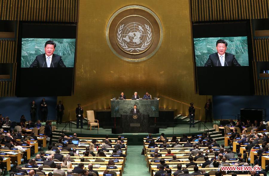 Xi hizo un discurso en la sede de la ONU titulado "Construir un Nuevo Tipo de Relaciones Internacionales Con cooperación de beneficio mutuo, crear una comunidad de destino común de la humanidad", en la que se renueva el compromiso de China "a los propósitos y principios de la Carta de la ONU, "reafirmar que China, como siempre, será un constructor mundo pacífico y se adhieren a la senda del desarrollo pacífico.
