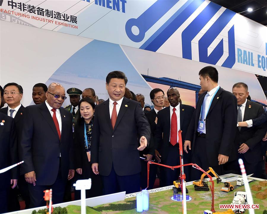 El presidente de China, Xi Jinping y el presidente de Sudáfrica, Jacob Zumavisitan la exposición de la industria manufacturera en Johannesburgo, Sudáfrica, 04 de diciembre de 2015. Xi, Zuma, y el presidente de Zimbabue, Robert Mugabe asistieron a la ceremonia de apertura de la exposición. (Foto: Ma Zhancheng)