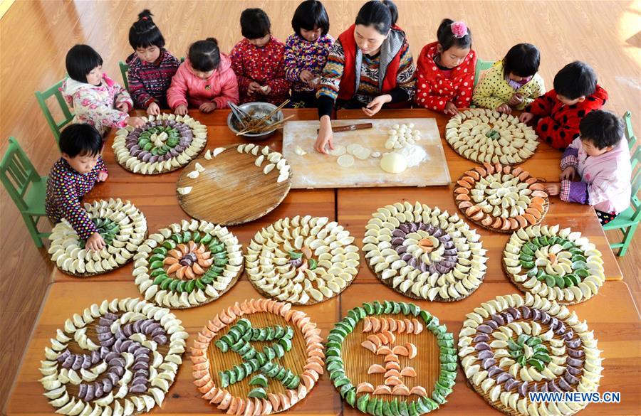 Los ni?os aprenden a hacer ravioles en una guardería del condado Yiyuan, provincia de Shandong, el 21 de diciembre de 2015. Comer ravioles es una costumbre en muchas partes de China, sobre todo en el norte del país, para celebrar la llegada del solsticio de invierno, ya que son sinónimo de buena suerte y salud. (Xinhua/Ding Genghou)