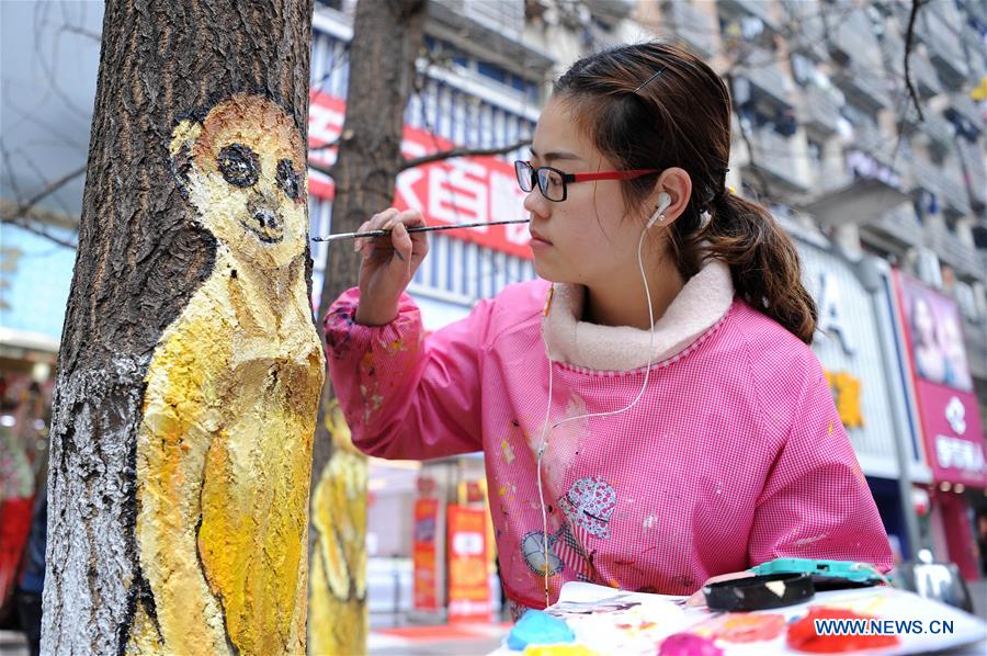 Una joven artista pinta el tronco de un árbol en la primera calle temática del arte del graffiti en Chongqing, el 5 de enero de 2016. (Xinhua/Tang Yi)