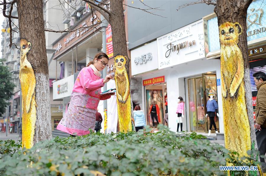 Chongqing,06/01/2016(El Pueblo en Línea)-Una joven artista pinta el tronco de un árbol en la primera calle temática del arte del graffiti en Chongqing, el 5 de enero de 2016. (Xinhua/Tang Yi)