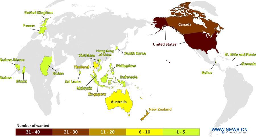 Gráficos de la página web de la Comisión Central de Control Disciplinario del Partido Comunista de China muestra los países y regiones donde los sospechosos podrían huir. Hasta noviembre del 2015, un total de 738 sospechosos, incluyendo 18 fugitivos de "notificación roja" habían sido capturados en el extranjero durante la campa?a “Cazar al zorro” que comenzó en abril del pasado a?o. (Foto: Lu Zhe)