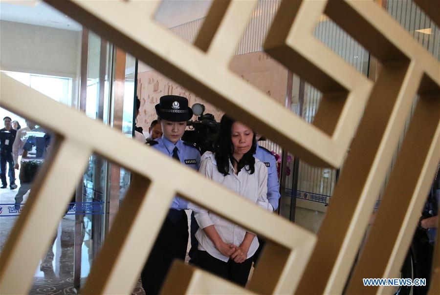 Kuang Wanfang (a la derecha), un sospechoso de delitos económicos, es escoltado en el aeropuerto de Changle en Fuzhou, provincia de Fujian. Ella que huyó a los EE.UU. en 2001, es sospechosa de haber participado en actos de corrupción y fue repatriada a China. Hasta noviembre del 2015, un total de 738 sospechosos, incluyendo 18 fugitivos de "notificación roja" habían sido capturados en el extranjero durante la campa?a “Cazar al zorro” que comenzó en abril del pasado a?o. (Foto: Yin Gang)