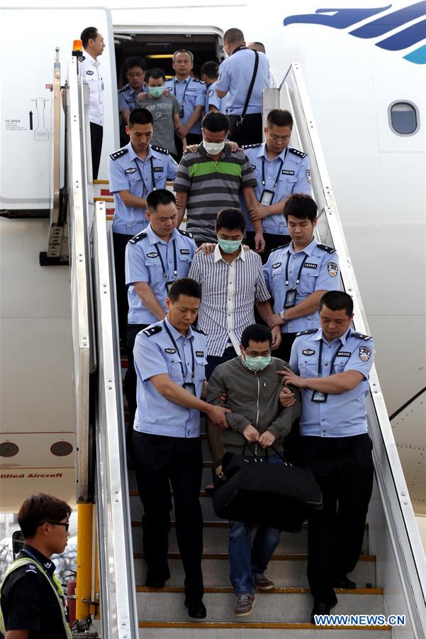 Pekín,08/01/2016(El Pueblo en Línea)- Seis fugitivos implicados en delitos económicos son extraditados bajo escolta desde Indonesia. Hasta noviembre del 2015, un total de 738 sospechosos, incluyendo 18 fugitivos de "notificación roja" habían sido capturados en el extranjero durante la campa?a “Cazar al zorro” que comenzó en abril del pasado a?o. (Foto: Li Mingfang)