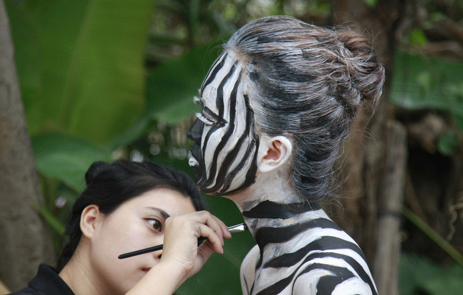 Artista pinta a una voluntaria para que parezca una cebra en el zoológico en la ciudad de Sanya, provincia de Hainan, el 10 de enero de 2016.