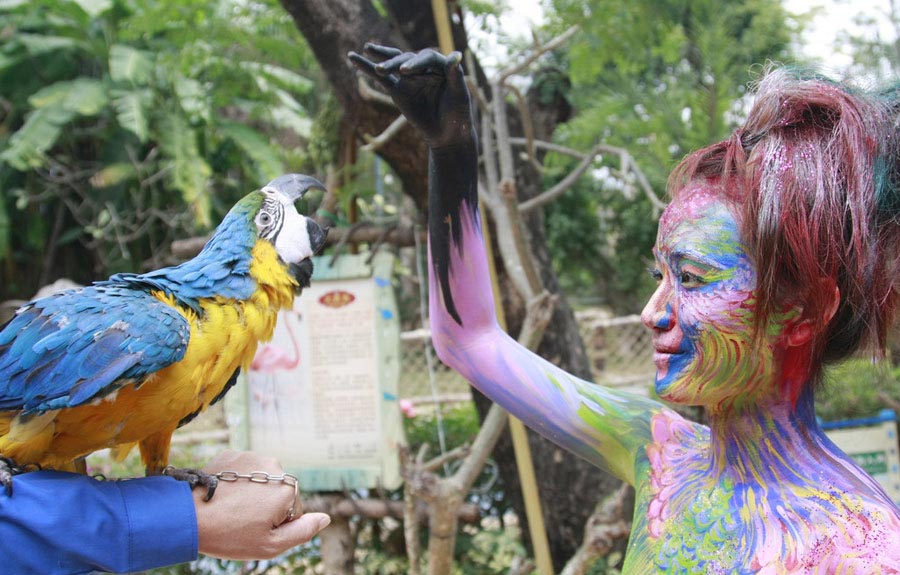 Sanya,12/01/2016(El Pueblo en Línea)-Decenas de mujeres se pintaron el cuerpo para imitar a animales salvajes como la cebra y el guacamayo y jugar con ellos en el zoológico de la ciudad de Sanya, provincia de Hainan, el domingo. La actividad tiene como objetivo concienciar sobre el respeto y la protección de los animales.