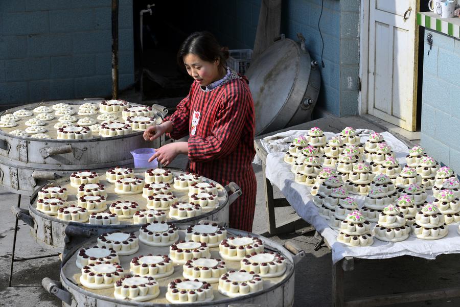 La campesina Wang Fei prepara pasteles con forma de flor hechos al vapor en Beiguan, condado Yanggu de Liaocheng, provincia de Shandong, el 18 de enero de 2016. [Foto/Xinhua]