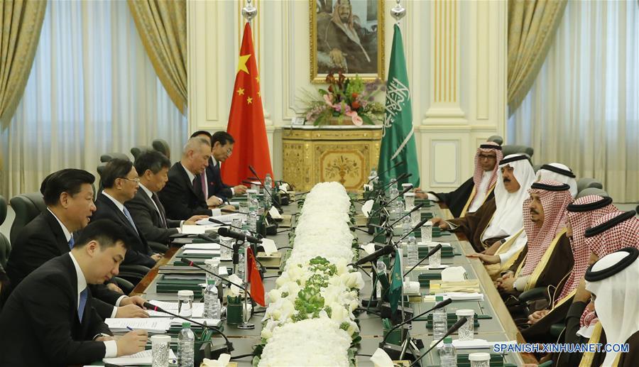 El presidente de China, Xi Jinping sostuvo una conversación con el rey saudí Salman bin Abdulaziz Al Saud (tercera R) en Riad, Arabia Saudita, 19 de enero, el 2016.(Xinhua/Ju Peng)