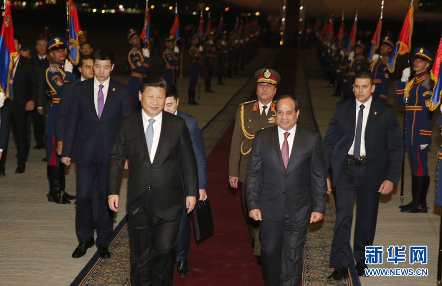 El presidente egipcio, Abdel Fattah al-Sisi saluda al presidente chino, Xi Jinping a su llegada a El Cairo, Egipto, 20 de enero de 2016.(Xinhua/Ju Peng)