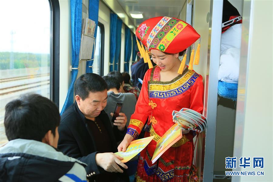 Imagen 1: El 24 de enero, trabajadoras del tren vestidas con trajes típicos reparten folletos de “Liu San Jie” a los pasajeros.
