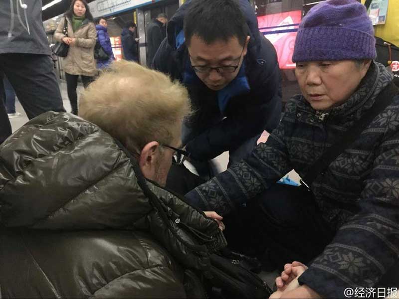 Pasajeros del metro de Beijing prestan ayuda a un extranjero que se desmayó (3)