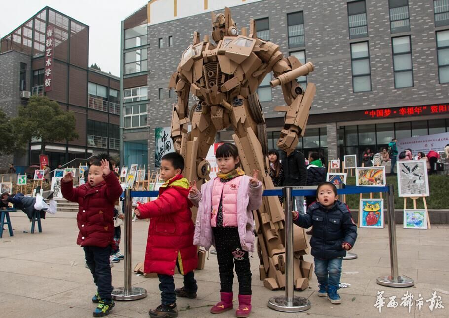 Xu Ou, de 35 a?os, construye un Transformer con más de 100 kilos de cajas de cartón en la ciudad de Ziyang, provincia de Sichuan. (Foto/West China Metropolis Daily)
