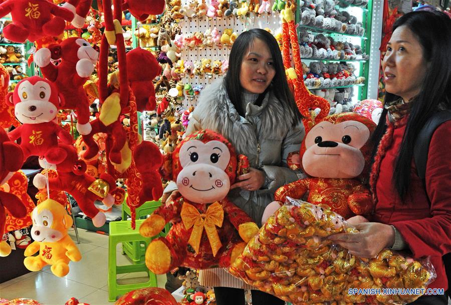 HANGZHOU, 2 feb (Xinhua) -- Una comerciante seleccionó un juguete de figura de mono en el Centro Internacional del Comercio en la ciudad de Yiwu, en la provincia oriental china de Zhejiang. (Xinhua/Tan Jin)