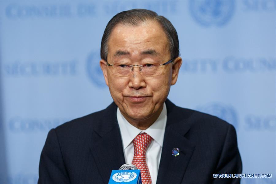 Secretario General de las Naciones Unidas, Ban Ki-moon, se emita una declaración sobre el fallecimiento del ex Secretario General de la ONU Boutros Boutros-Ghali, en la sede de la ONU en Nueva York, 16 de febrero 2016.(Xinhua/Li Muzi)