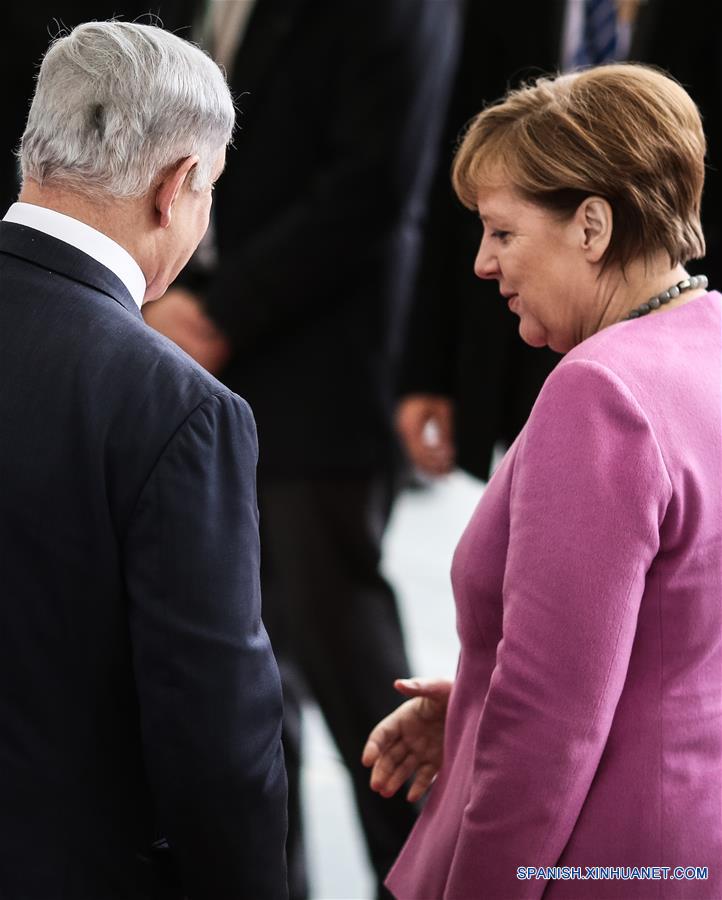 La canciller alemana, Angela Merkel y el primer ministro de Israel, Benjamin Netanyahu, asisten a una ceremonia de bienvenida en Berlín, Alemania, el 16 de febrero de 2016. (Xinhua / Zhang Fan)