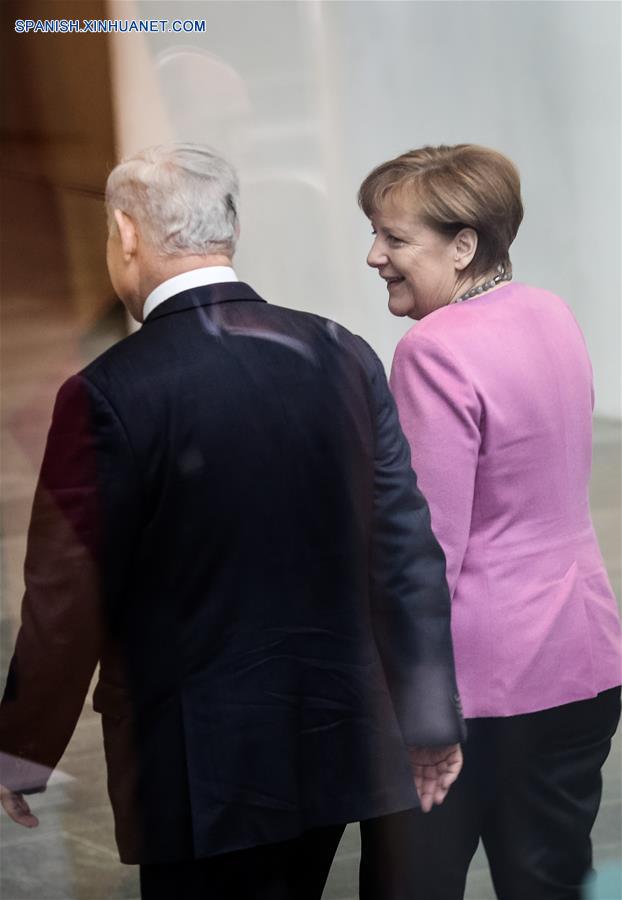 La canciller alemana, Angela Merkel y el primer ministro de Israel, Benjamin Netanyahu, asisten a una ceremonia de bienvenida en Berlín, Alemania, el 16 de febrero de 2016. (Xinhua / Zhang Fan)