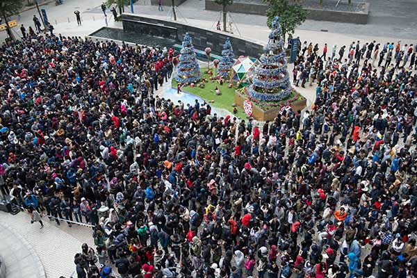 Empleados de Tencent hacen cola fuera de la sede para recibir sus sobres rojos de parte del presidente ejecutivo Pony Ma en Shenzhen, provincia de Guangdong, el 15 de febrero de 2016.