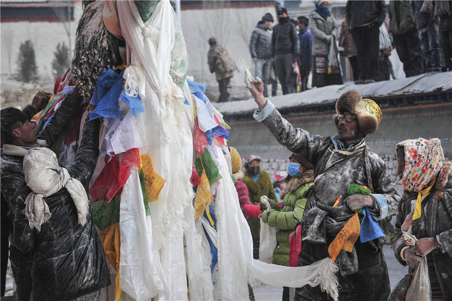 La ceremonia de adoración se celebra cada a?o en la plaza del monasterio Palcho del condado Gyantse, prefectura de Xigaze, región autónoma del Tíbet, el día 15 del primer mes del calendario tibetano, que coincide con el último día del a?o nuevo tibetano, el 22 de febrero de 2016. [Foto por Li Zhou / de China Daily]