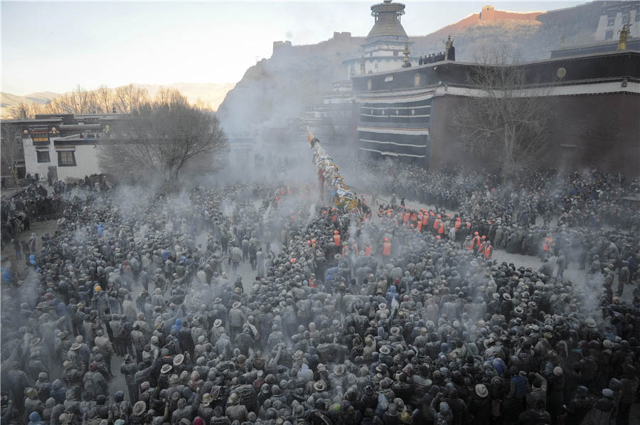Lhasa,23/02/2016(El Pueblo en Línea)-Zanba, o harina de cebada qingke tostada, flota en el aire durante la ceremonia tibetana de adoración attendinga en la plaza del monasterio Palcho del condado Gyantse, prefectura de Xigaze, región autónoma del Tíbet, el día 15 del primer mes del calendario tibetano, que coincide con el último día del a?o nuevo tibetano, el 22 de febrero de 2016. [Foto por Li Zhou / de China Daily]